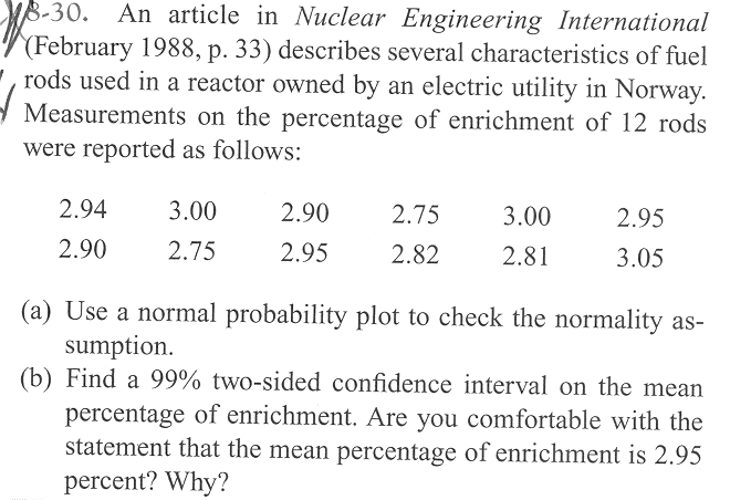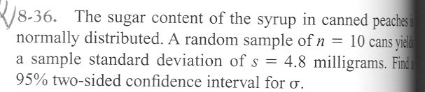 If \(s^2\) is the sample variance from a random sample of \(n\) observations from a normal distribution with unknown variance \(\sigma^2\), then a \(100(1-\alpha)\%\) confidence interval on \(\sigma^2\) is