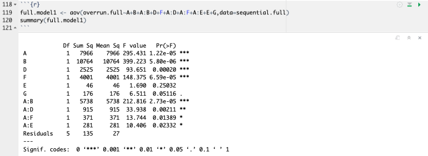 - From aliasing scheme of B, AD and/or DF and/or EG could be responsible for large effect estimate for B (with or without B being large),
